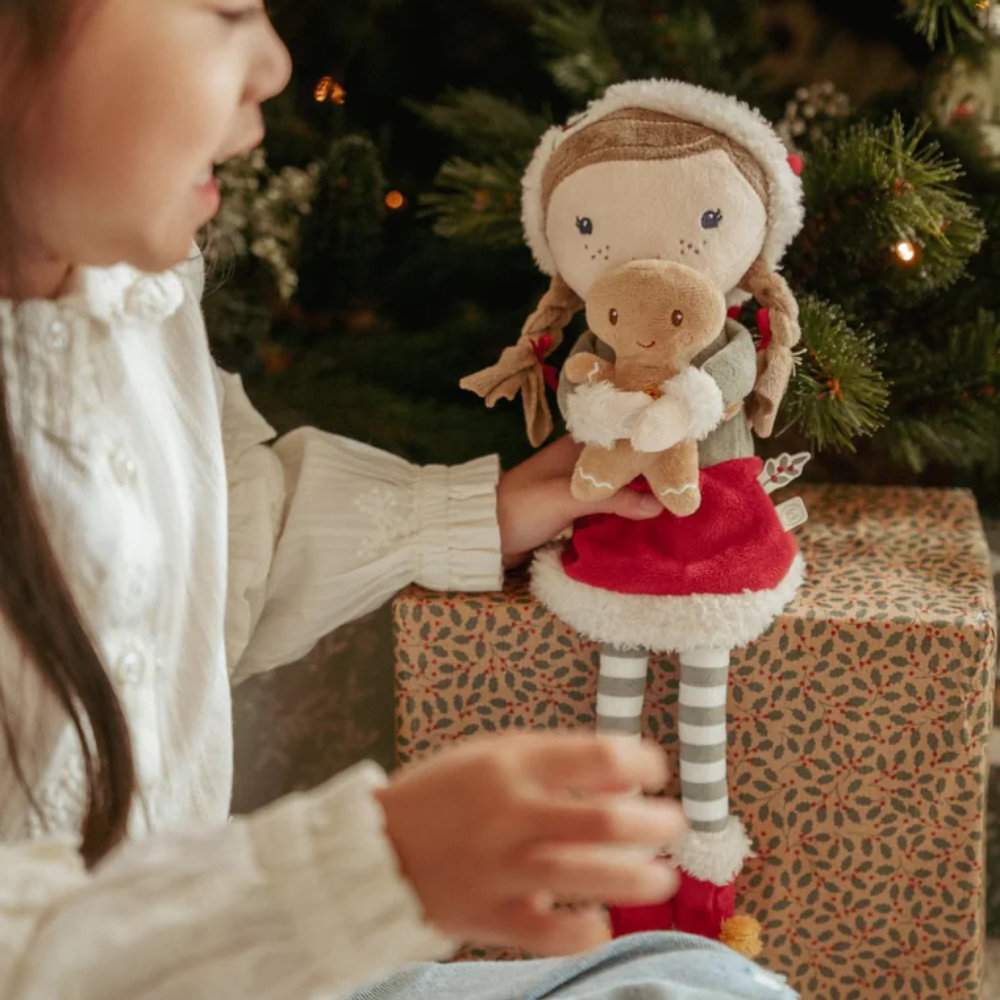 Cuddle Buddy Rosa by Little Dutch is ready to spread Christmas cheer! Dressed in her festive red hat and matching outfit, she holds a little gingerbread man in her hands, she's the perfect companion for holiday fun. With Velcro on her hands, Rosa can keep her cookie friend close or hold another tiny Christmas accessory your child chooses.