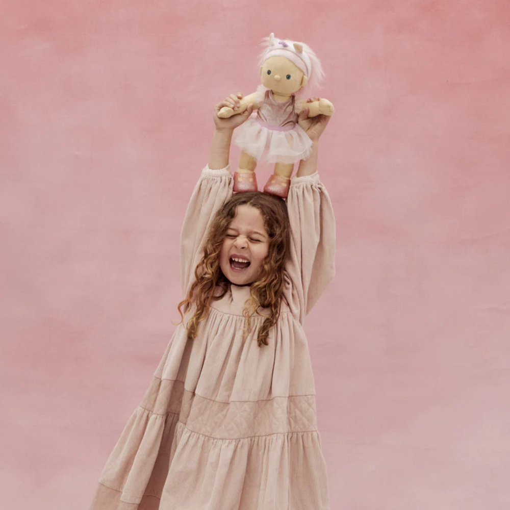 Meet Dream Dinkum Doll Pixie from Olli Ella. She brings a little one's world of magic and dreams to life and is always ready for adventures filled with wonder. Made from soft fabric and dressed in a velvet leotard with a glittery tulle tutu, plush iridescent wings, and a sparkling unicorn headband, Pixie is made for flights of fancy and sweet snuggles alike. With posable arms, legs, and a head that moves, Pixie can sit, stand, and pose for all sorts of imaginative play. Glittery shoes and cozy socks complete the enchanted look, making Pixie the perfect companion for twirls, tea parties, and dreamy naps. The soft cotton body and removable outfit mean Pixie is ready to be loved, dressed, and cherished through every adventure.