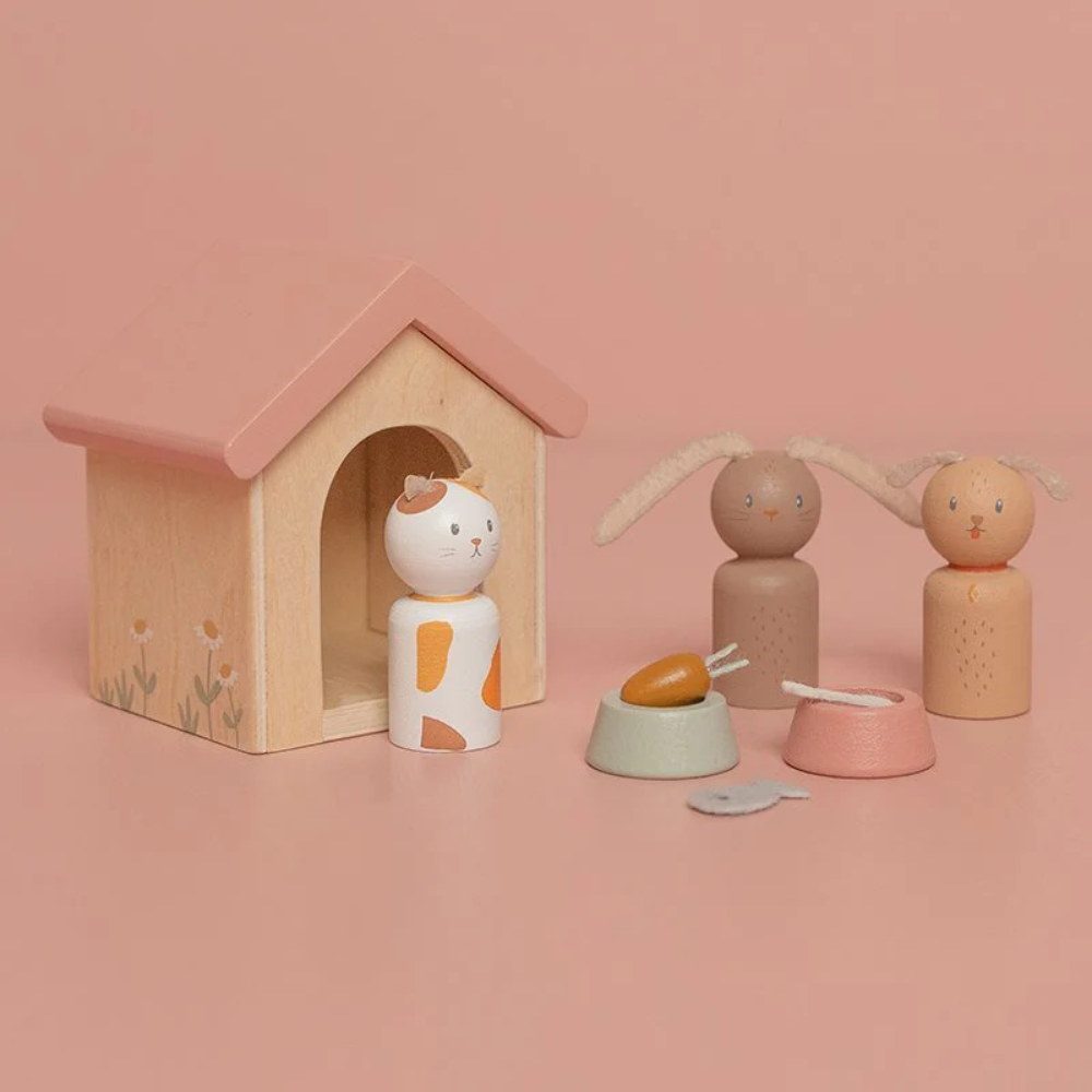 Bring your Little Dutch dolls house to life with the adorable Pet Expansion Set. Welcome a loyal dog, a sweet bunny and a cuddly cat into the family, complete with cosy beds, food bowls and fun toys. Perfect for creating heart-warming adventures and imaginative play, this charming set turns any dollhouse into a mini animal kingdom.