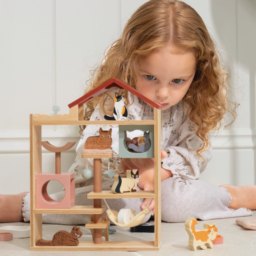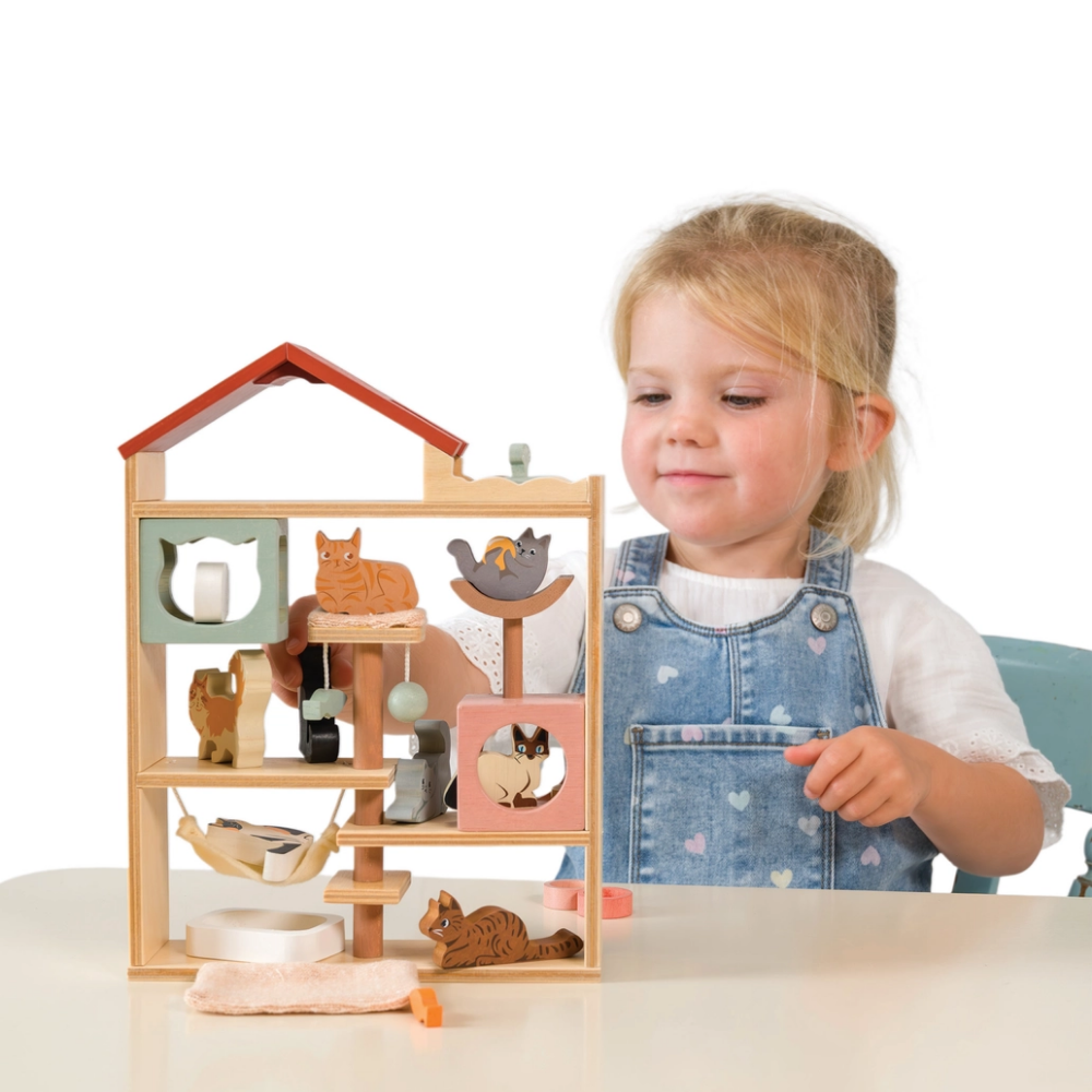 Create a miniature world of feline fun with the Purrfect Stay Cat Hotel by Tender Leaf Toys. This adorable wooden playset includes 9 cute cats and kittens, cosy beds, cushions and feeding accessories so children can care for their furry guests and enjoy imaginative dolls house play.